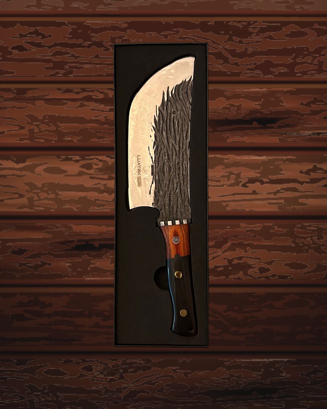 Sua lâmina robusta com textura artesanal transmite autenticidade, enquanto o cabo de madeira escura, com detalhes metálicos, oferece pegada firme, conforto e sofisticação.